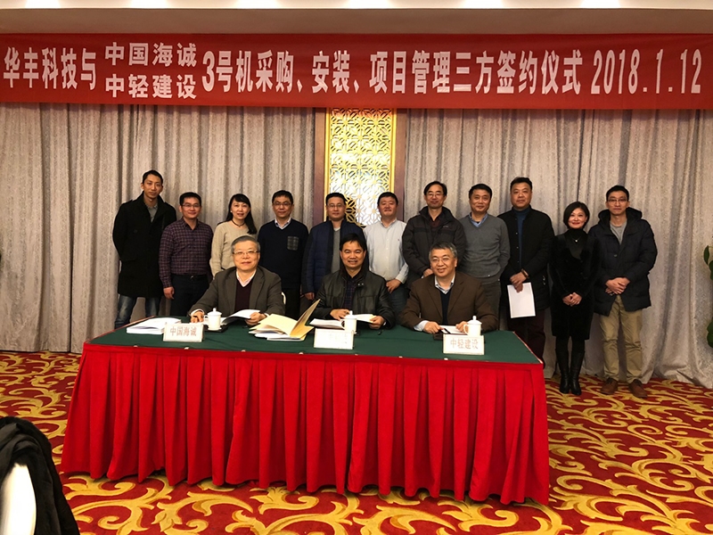 On January 12, the three-party signing ceremony for procurement, installation and project management of dedicated devices for Paper Machine 3# of the 65,000 t/a production line of supporting paper for cigarette products of Zhejiang Huafeng Paper and Technology Co., Ltd. was held in Anji, Zhejiang Province. Xu Datong, Party Secretary and President of China Haisum Engineering Co., Ltd., Wang Haipei, Chairman of Huafeng Group, and Yu Dingrong, Chairman of China Light Industry Construction were present at the signing ceremony and signed the contract on behalf of the three parties.