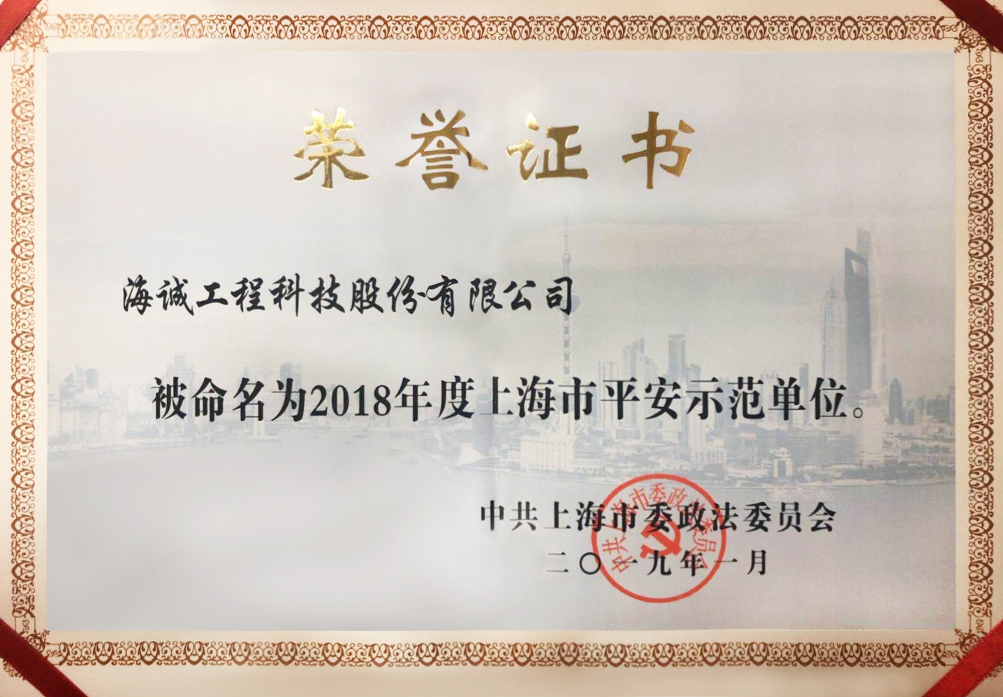 China Haisum Engineering Co., Ltd. under Sinolight Corporation won the honorary title of "Safety Demonstration Organization" in Shanghai in 2018 granted by the Judicial and Legal Affairs Committee under CPC Shanghai Municipal Committee a few days ago. This award aims to recognize the contributions made by enterprises in promoting security guard, improving the quality of safety building, firmly establishing the sense of safety responsibility, and actively creating a safe and stable social environment.