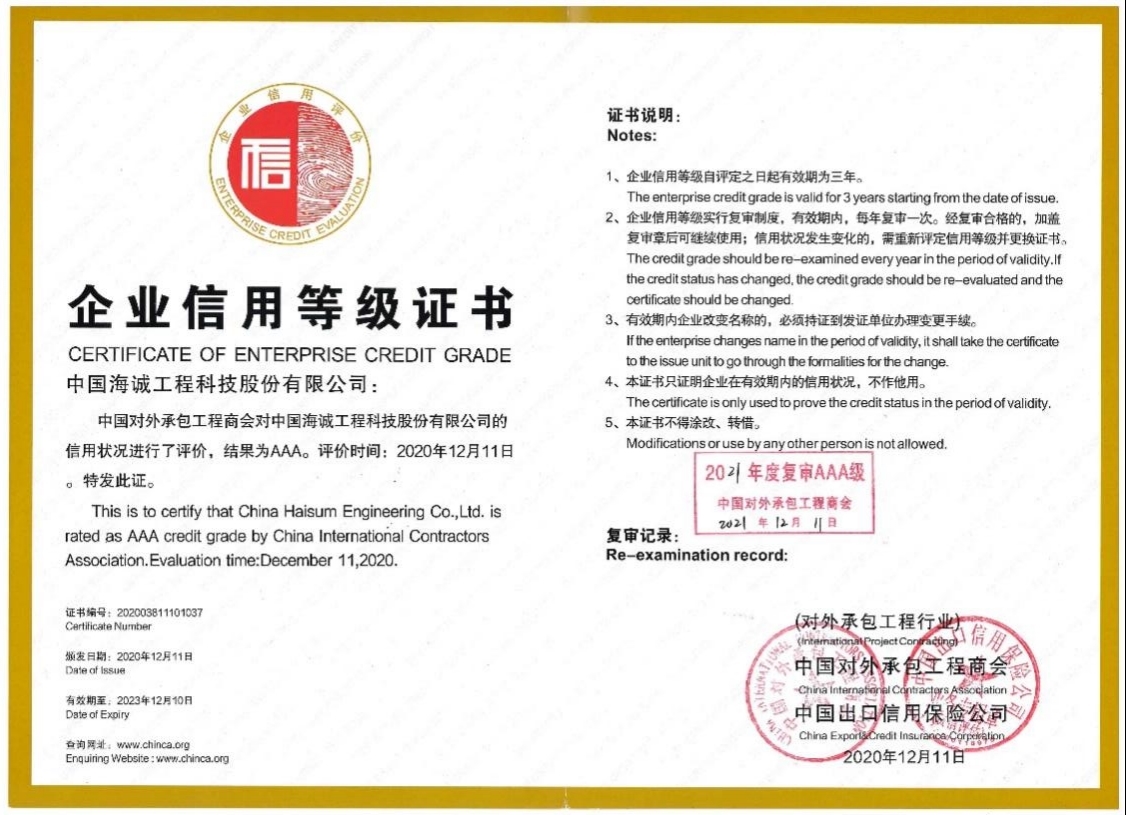 The AAA-level enterprise credit rating is recognized by the national commercial authority. It is organized by the China International Contractors Association and is a professional and authoritative credit rating assessed by China Export & Credit Insurance Corporation, mainly scrutinizing the comprehensive quality, competitiveness, financial status, credit record, overseas market development and project execution of a company. Since the implementation, this credit rating evaluation has become an important proof of a company's comprehensive capability in overseas business.