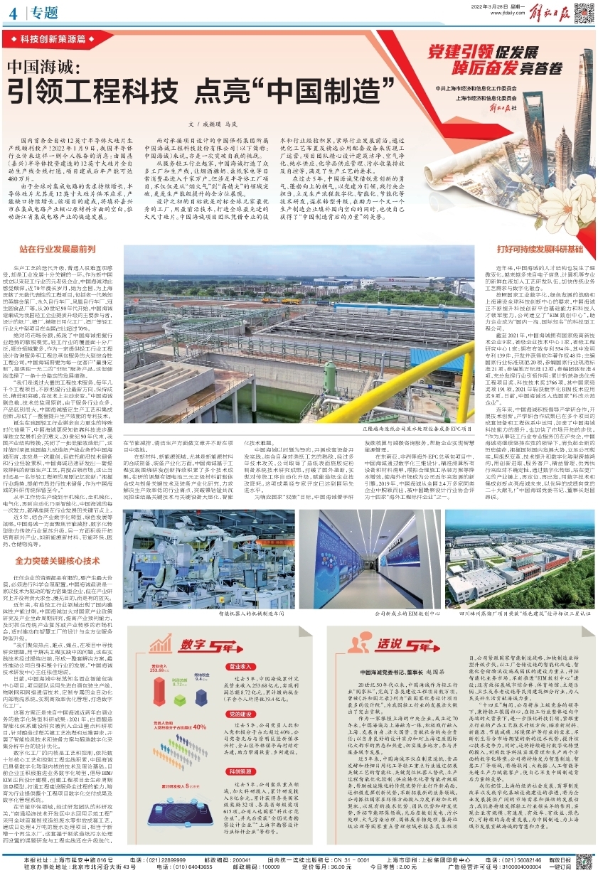 On March 28, Liberation Daily published a report entitled "China Haisum: Leading Engineering Technology, Illuminating 'Made in China'" in the special edition of "Led by the Party's building, new developments and achievements are obtained with striving spirit and unremitting efforts", which reported that since the 19th National Congress of the Communist Party of China, China Haisum has relied on the courage in innovation and vigorous vitality and based on the research and development of technologies such as digitalization, intelligence and energy saving in production processes to seek for transformation and upgrading under the leadership of the Party, and while helping many manufacturing enterprises to fill the domestic production gaps, it has also won the reputation of "the power behind China's manufacturing".