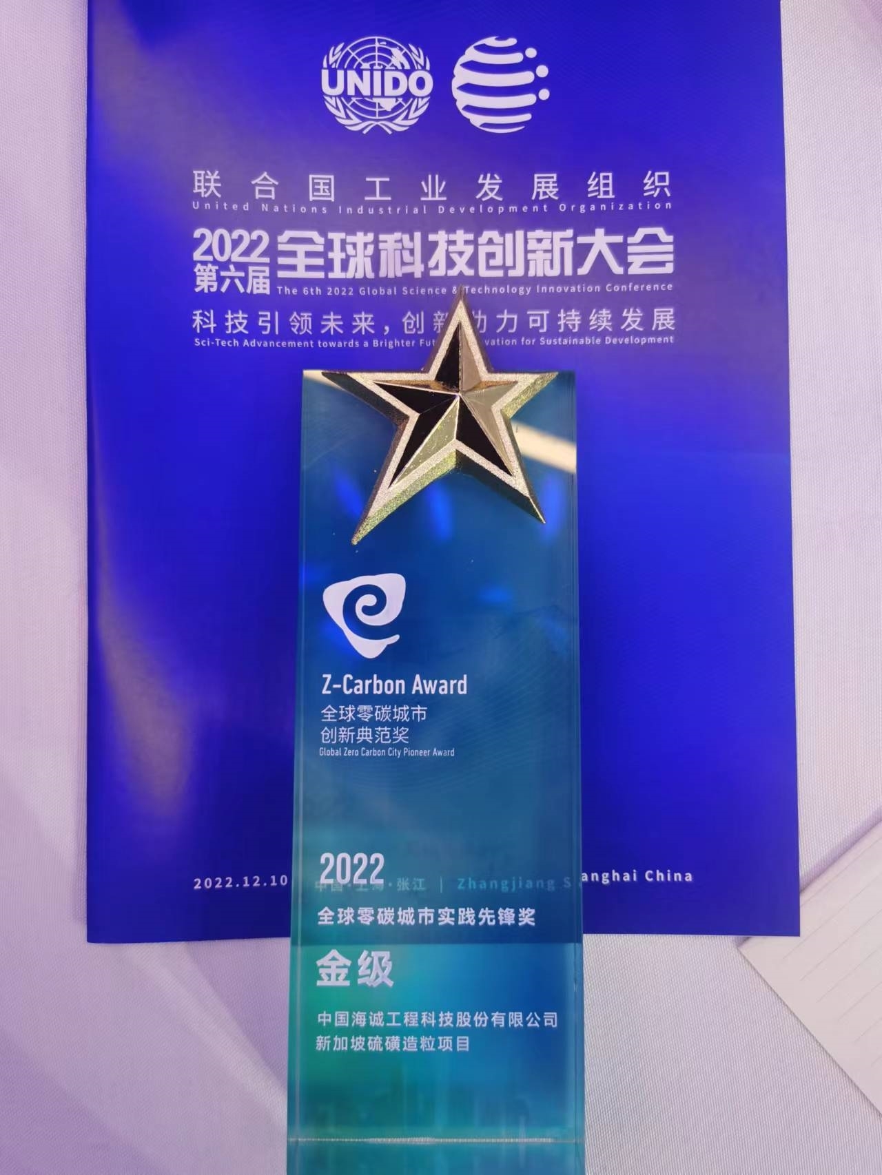On December 10, 2022, the 6th 2022 UNIDO Global Science and Technology Innovation Conference was successfully held in Shanghai. At the Conference, China Haisum was awarded the "Global Zero Carbon City Innovation Pioneer Award", and the "Singapore Sulfur Granulation Project" contracted by China Haisum won the "2022 Global Zero Carbon City Practice Pioneer Global Award".
