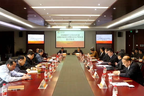 2018年4月9日,中輕集團子公司2018年度經營目標責任書暨安全生產責任書簽字儀式在中輕集團總部舉行。保利集團黨委常委、副總經理、中輕集團黨委書記、董事長陳鄂生在簽字儀式上作重要講話。中輕集團總經理俞海星代表中輕集團與10家子公司主要負責人簽訂了2018年度經營目標責任書和安全生產責任書。中輕集團副總經理任建平主持了簽字儀式,中輕集團領導班子成員、子公司主要負責人、中輕集團總部各部室負責人出席了簽字儀式。