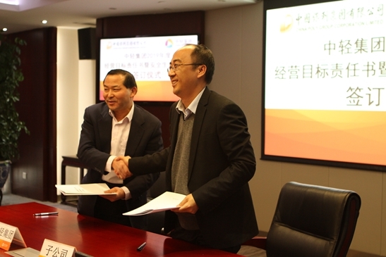 郭建全在講話中簡要回顧了中輕集團2018年生產經營工作總體情況,點明了子公司負責人經營業績考核辦法修訂的核心目的,闡述了子公司經營目標責任書對助力提升發展質量、助推改革創新升級、引領子公司爭創卓越業績等五個方面的導向作用,并就如何如期實現2019年的各項經營目標任務提出了三點要求,一要強化戰略執行,確保集團發展戰略規劃順利推進;二要做好2019年度經營目標和發展改革任務在各板塊的分解落實,提升集團發展質量;三要把風險管控放在第一位,為集團發展保駕護航。他強調各子公司要聚焦變革突破、聚力價值創造,攻堅克難,確保簽訂的經營目標責任書中各項目標任務圓滿完成,為集團高質量發展提供有力支撐,為把集團公司打造成國際知名國內領先的輕工科技創新產業集團貢獻更大力量!
