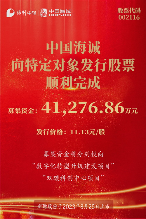 2023年8月8日,保利中輕所屬中國海誠成功向特定對象發行股票并完成資金募集,新增股份于8月25日上市。
