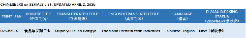 4月7日,保利中輕所屬中國食品發酵工業研究院(簡稱“中國食品院”)主辦的學術期刊《食品與發酵工業》成功入選國際數據庫《工程索引》(EI Compendex),成為全球被收錄的79種食品科學類期刊之一。這是《食品與發酵工業》發展歷程中又一重要里程碑,標志著該期刊學術價值、研究質量及國際化水平獲得國際權威機構的高度認可與肯定,彰顯中國食品院科技期刊學術引領力和國際影響力得到極大提升。