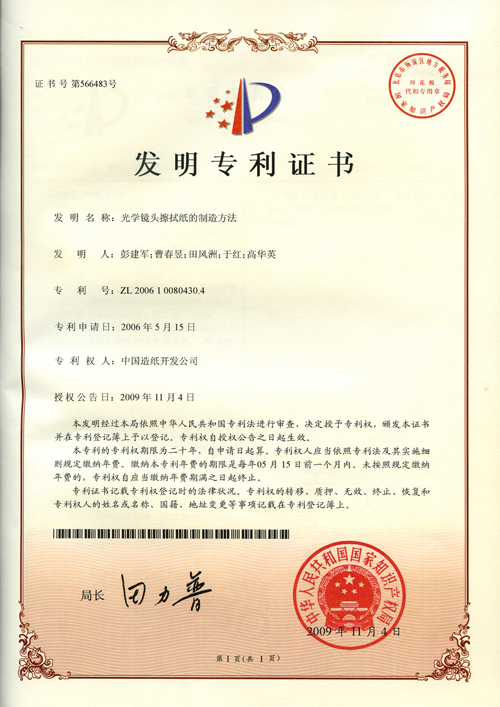 由中國制漿造紙研究院申請的兩項發明專利“光學鏡頭擦拭紙的制造方法”和“全熱空氣換熱器紙芯用隔離紙的制造技術”于11月4日獲得國家知識產權局專利授權。