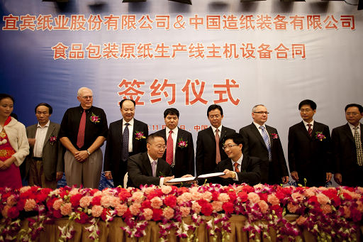 中國造紙裝備公司董事長、總經理馬思一、宜賓紙業董事長易從分別代表雙方公司致辭,宜賓紙業總裁王曉華和裝備公司副總經理周后煉代表雙方簽署合同文本。