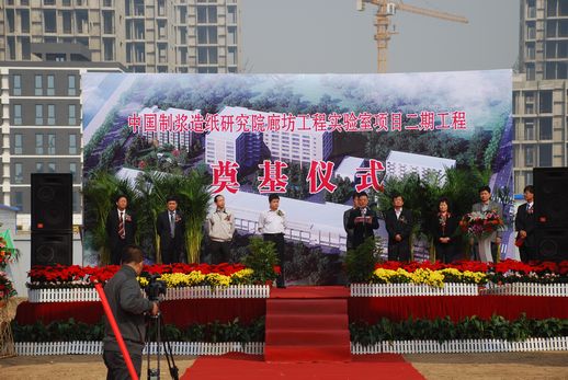2012年10月12日,俞海星總經理出席了中國制漿造紙研究院廊坊工程實驗室項目二期工程開工奠基儀式。俞總在致辭中對造紙院廊坊項目建設工作給予了充分肯定,對長期以來關心和支持中輕集團發展,特別是關心和支持該項目籌備實施的廊坊市各級領導和部門表示了感謝,并向為工程開工付出辛勤勞動的一線干部職工表示了慰問。他希望項目承建單位要切實增強緊迫感和責任感,嚴格工程管理,確保安全、質量和進度,力爭把項目建設成為廊坊科技谷的標志性、樣板性工程。中國制漿造紙研究院院長曹春昱和廊坊科技谷有關領導也分別在儀式上致辭。