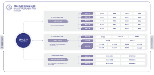 《保利品行-保利集團行為手冊》搭建卓越行為識別體系框架,明晰了全體保利人的卓越行為倡導,以共同行為準則、基本禮儀規范、關鍵品牌觸點行為支撐品行之樹,規范全體保利人的知與行。